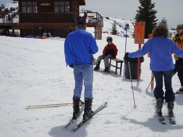 Getting on and off chair lifts is a lot less scary than it seems to be. Be sure you are comfortable moving around on flat snow before you simply run out and hop on the lifts. To get on a lift you simply wait in line until you get to the “Wait Here” spot, then you wait until the chair in front of you passes you and once it’s in front of you, you follow it to where the group in front of you is getting on that chair. You then wait for the chair behind you to come and scoop you up. To avoid any accidents in that process, be sure your poles aren’t planted in the snow, your skis are both clipped in, and you have no loose clothing.